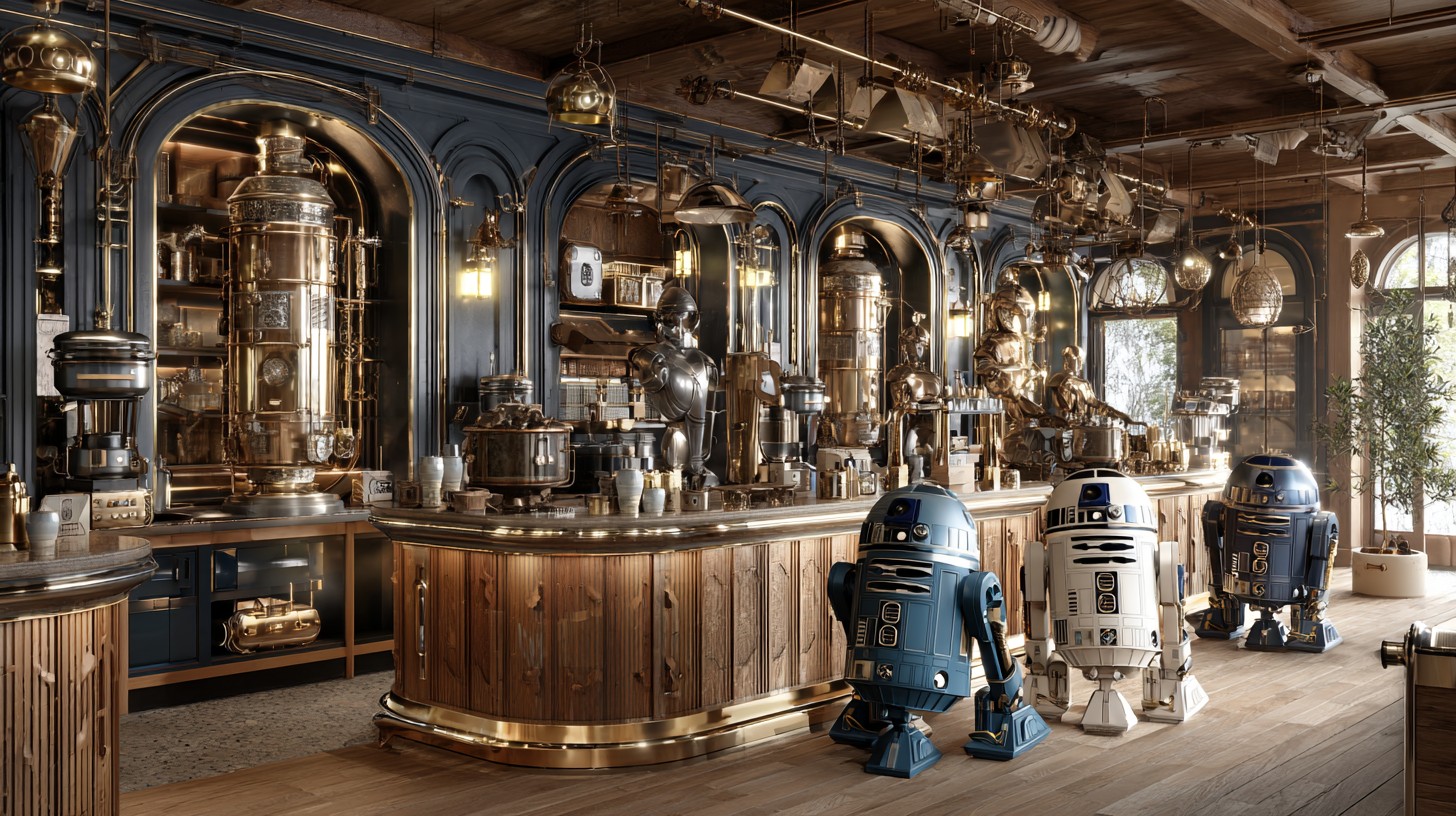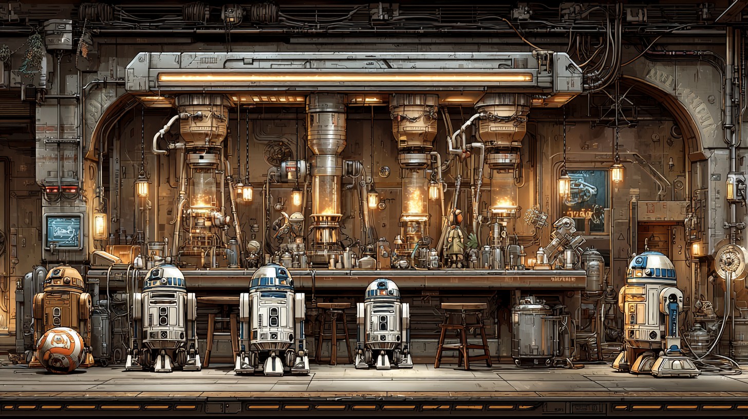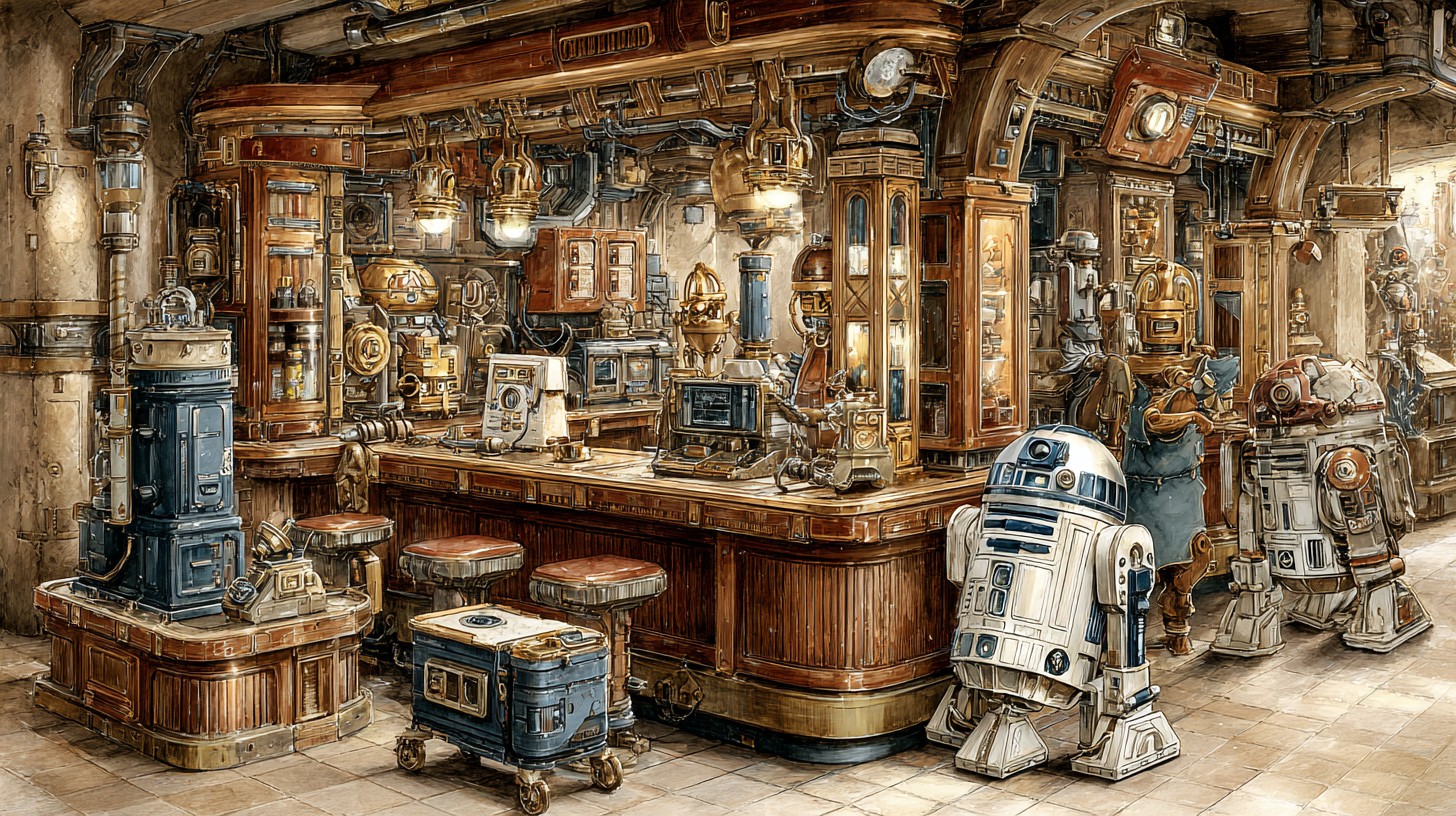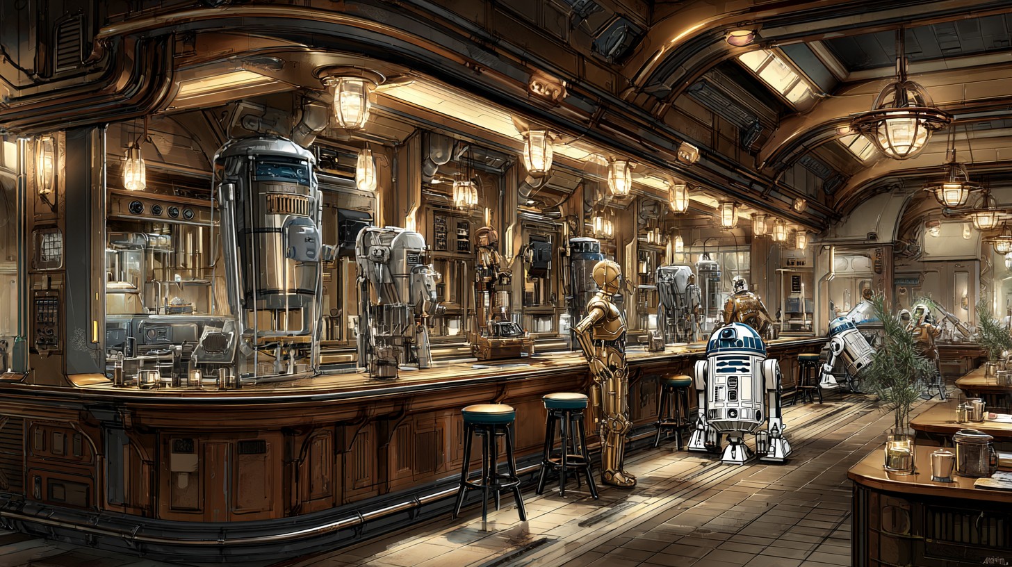 Prompt:Miyazaki hand-drawn style, a Star Wars cantina scene reimagined as a robot-only service bar, droids and service bots lined up, bartender unit dispensing battery cells, fuel canisters, spare parts, and wash-care stations, warm wood and brass mixed with sci-fi panels, lantern glow and soft rim light, cinematic atmosphere, 35mm equivalent, medium shot, eye-level, rule of thirds, clean silhouette, strong subject-background separation, palette of warm amber, deep navy, muted teal, and brass accents, gentle dust motes, subtle steam, friendly bustling mood –ar 16:9 –stylize 170 –chaos 5 –v 7.0 –no humans, organic characters, text, watermark, logo, gore, violence, cluttered foreground, low-res –p lh4so59