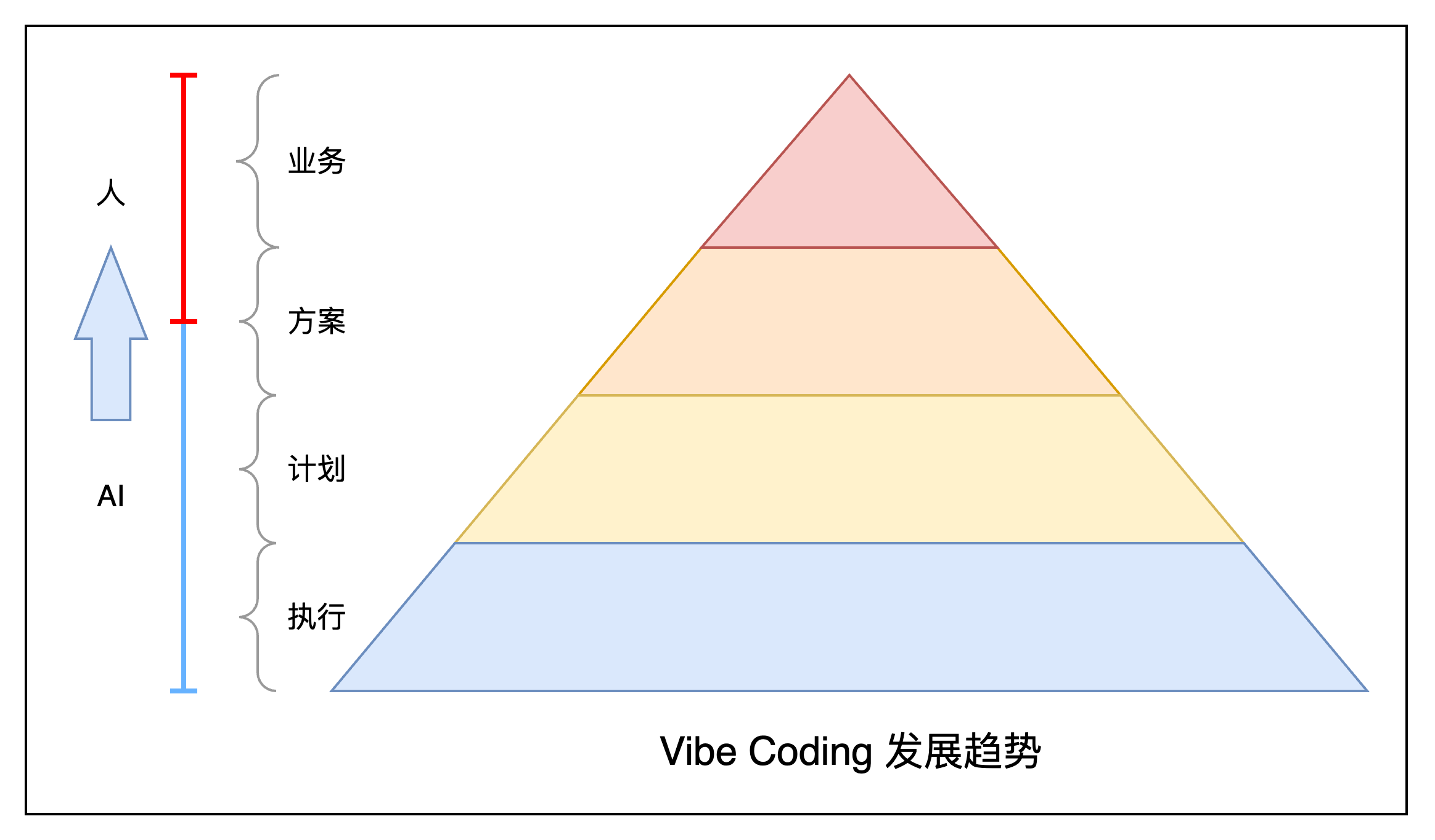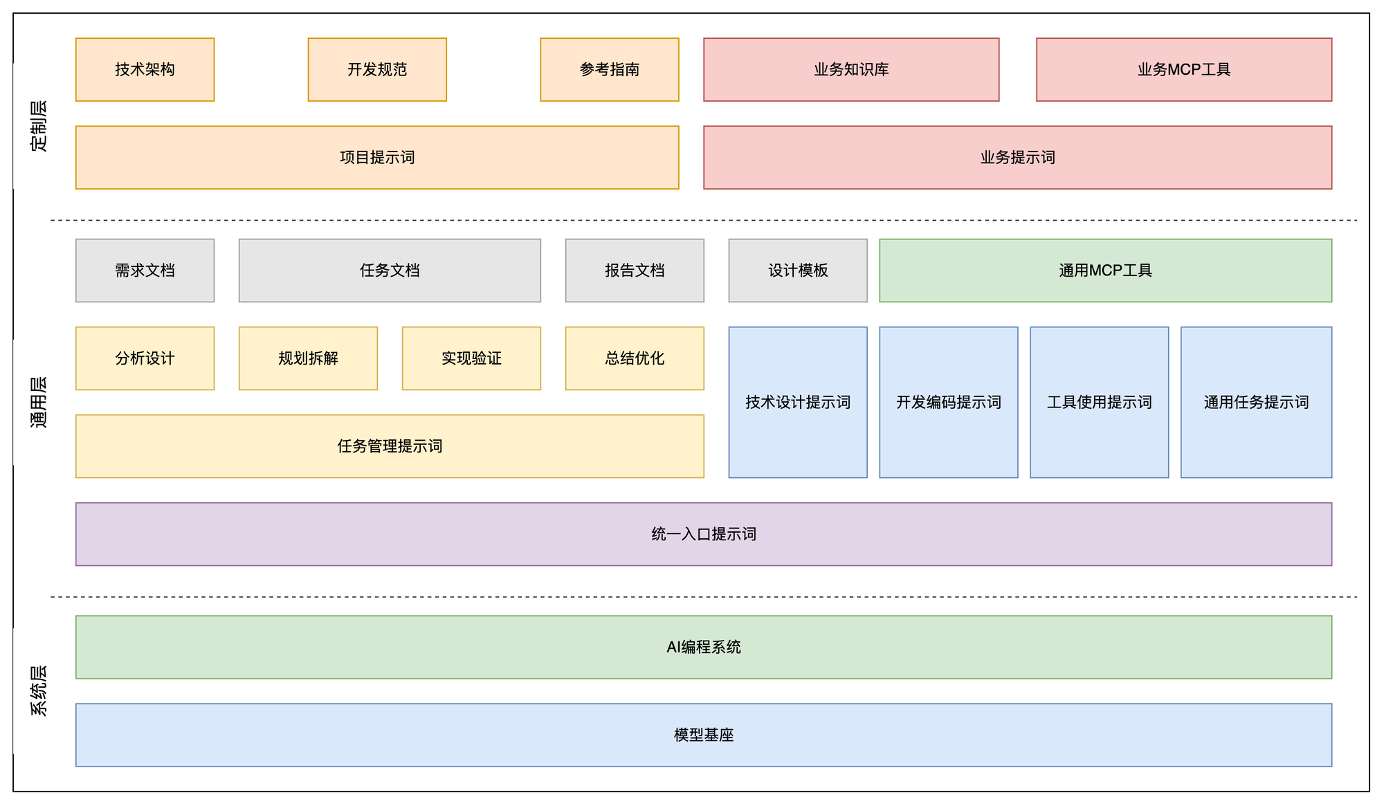 以Cursor和Claude Code为代表Vibe Coding工具正在快速迭代,Vibe Coding的架构是时刻在演进和变化,我根据自己的理解比较理想化给出Vibe Coding的分层架构,与上面发展趋势图相对应,Vibe Coding发展到最后就是这张图只剩下蓝色框框没有其他颜色🥳。