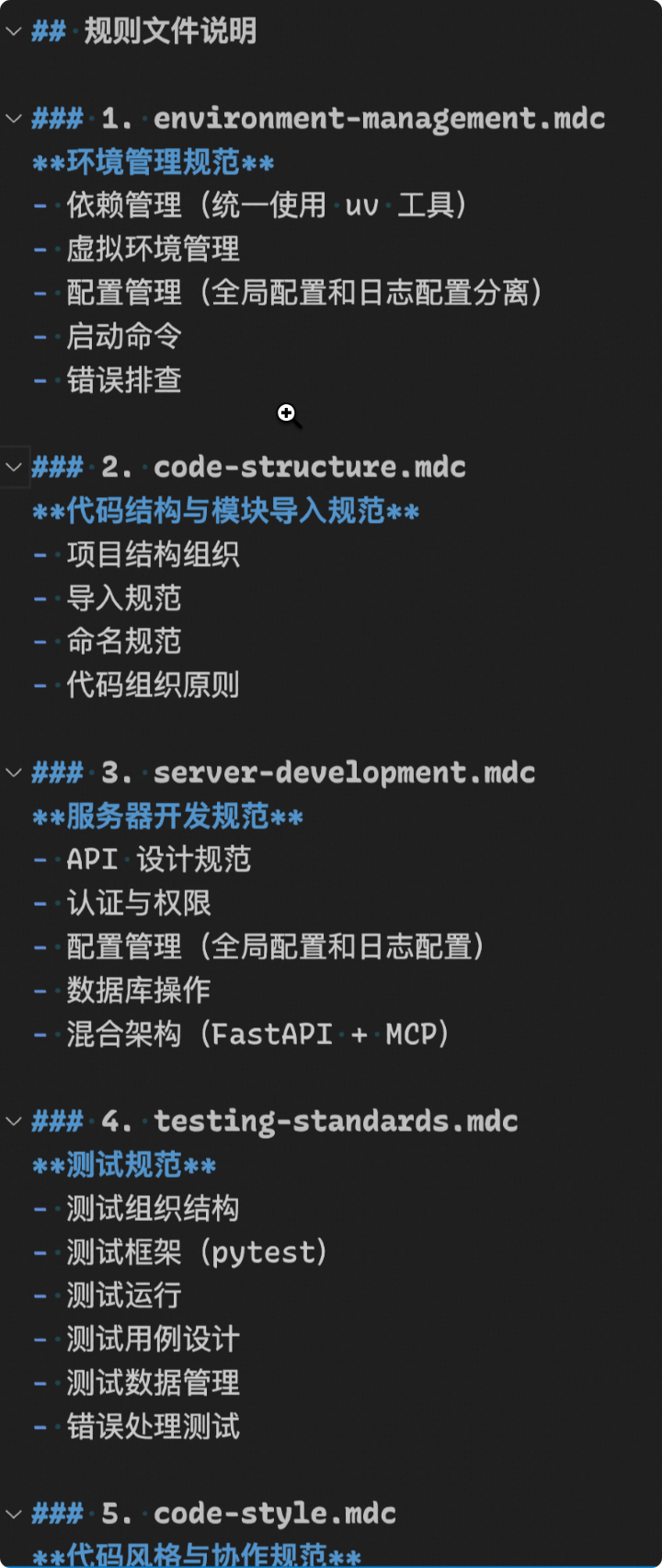 - 最重要的原则,Curosr能写出符合要求的好代码的前提是它有足够的上下文,包括:项目、需求、架构、技术栈、编程约定等等;