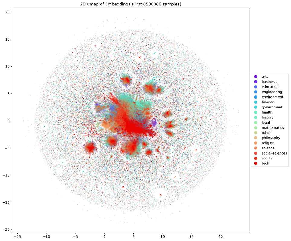 文章对 800 万个 PDF 文件(解压后 8TB)作分类分析,使用了 LLMs、Embeddings Models、XGBoost 以及 LinearRegressor,绘制了一些漂亮的图表。