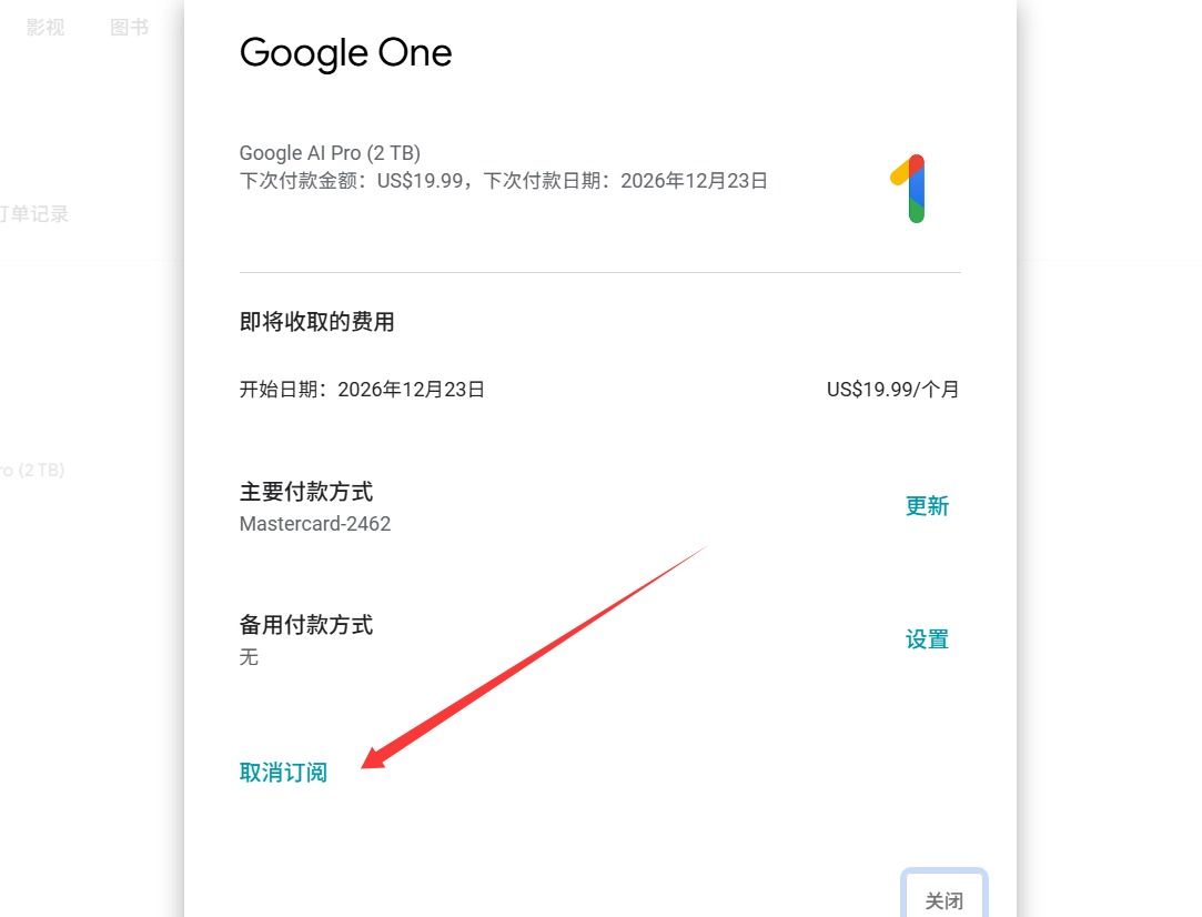 为了防止到期后扣费,我们可以删除掉支付方式。不会影响订阅时间。