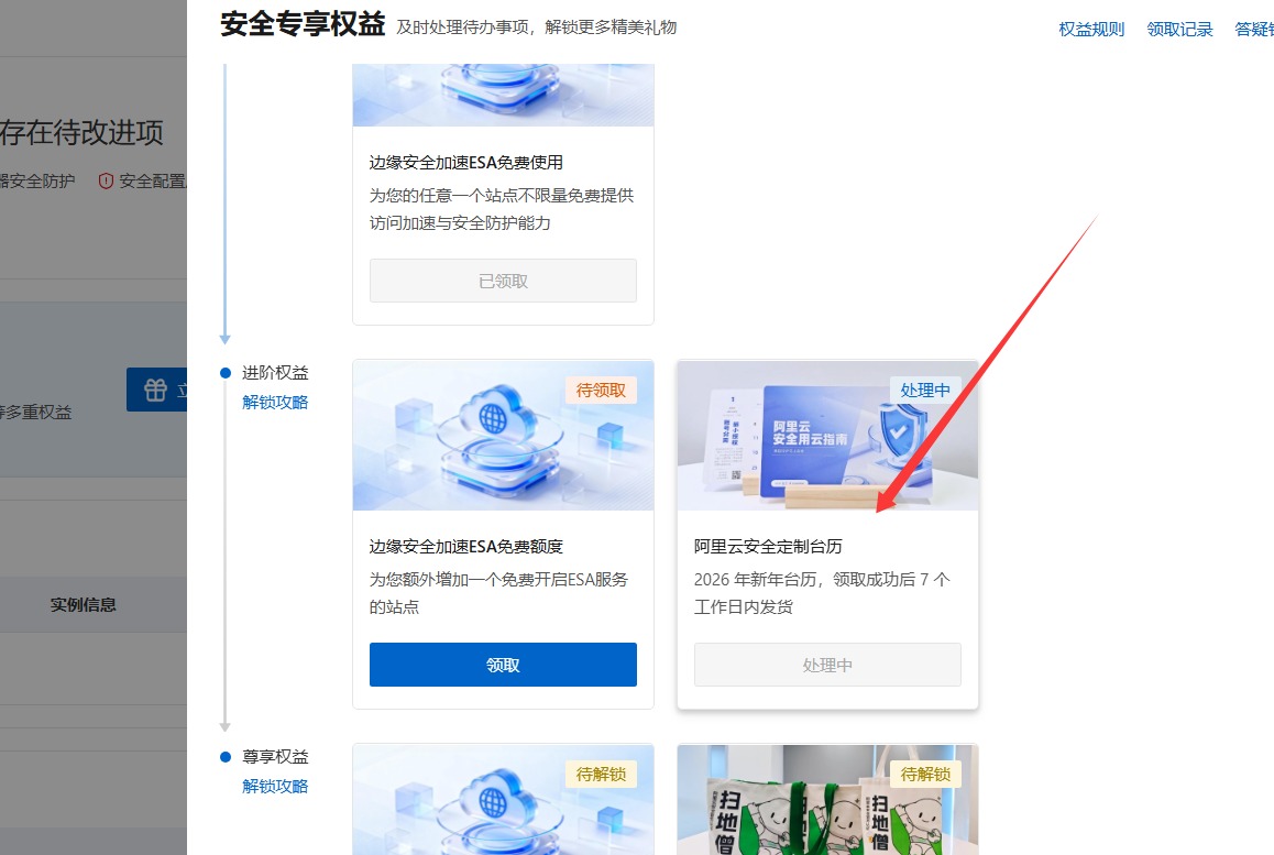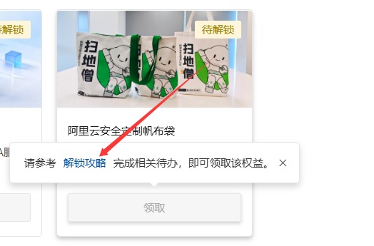 在页面内安全专享权益点击领取,如果领取按钮是灰色。就查看对应攻略,处理一部分安全事项就可以领取了。
