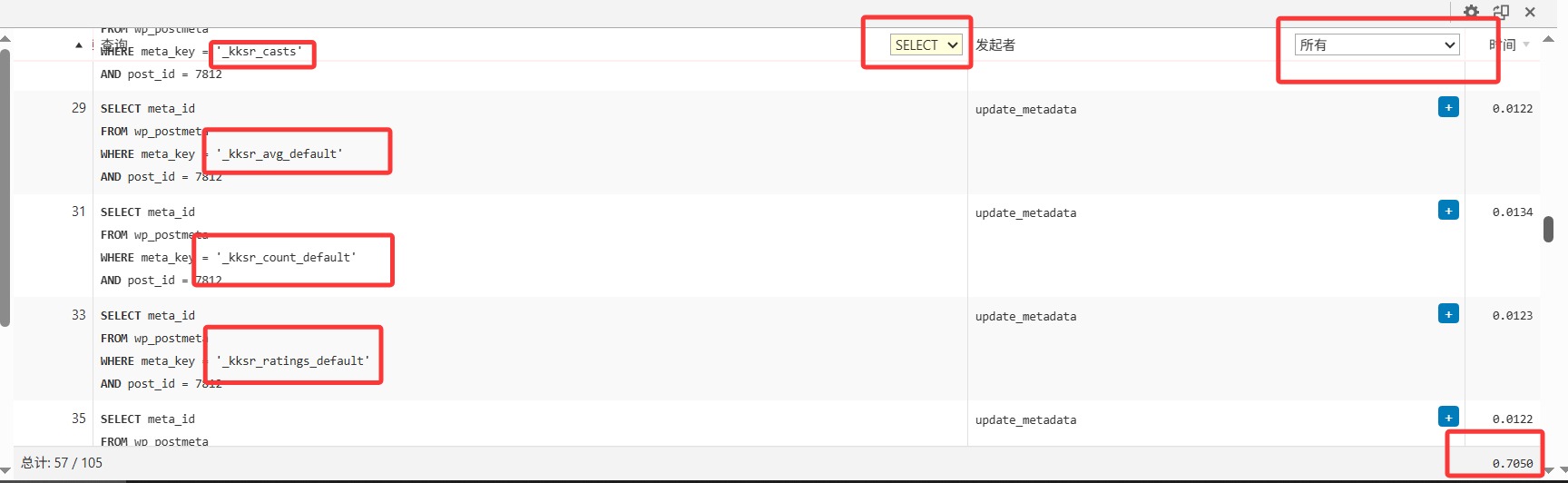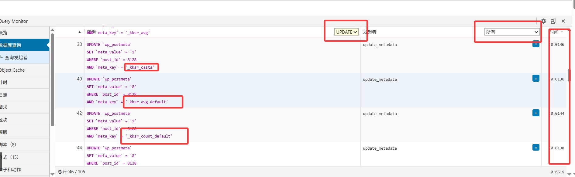 上图是kk Star Ratings插件的写入操作45次,造成了0.6519秒的页面延时。