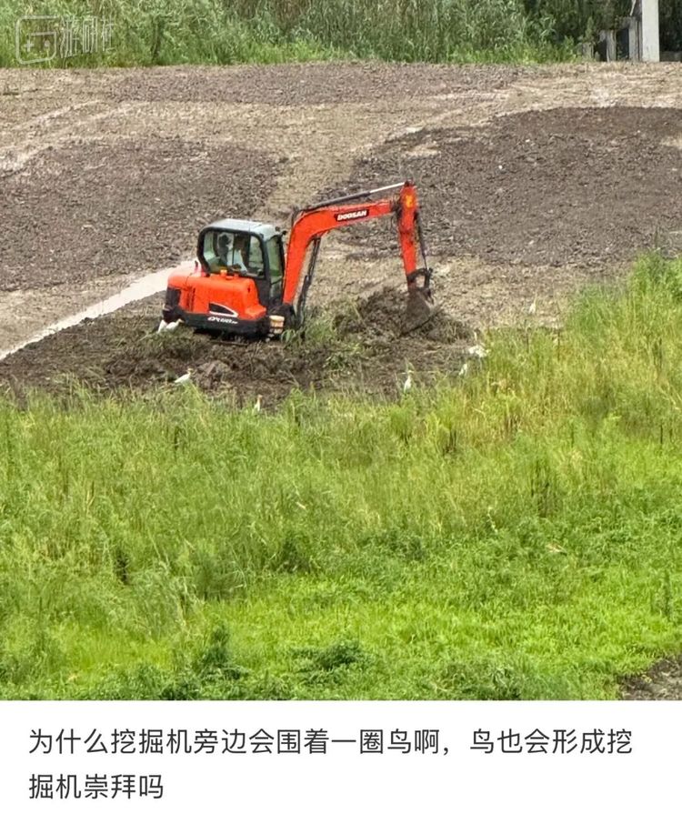 现在不止大爷,挖掘机旁边还会长鸟。