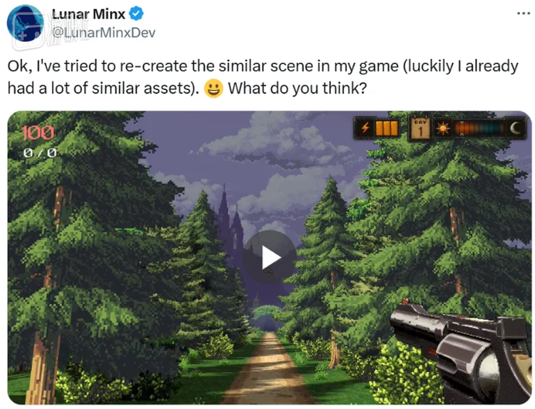但平心而论,在其他同行放出的如此多演示视频里,若要论精美程度和画面细节,那段AI生成的视频依旧排在前列,甚至可以说还是最好的那个——这也是AI残酷的地方,当它真能做出让人类赞叹的效果,就会影响到很多独立游戏作者的信心。