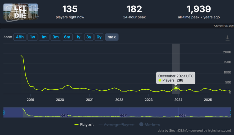 即便是历史最高数据,《Let It Die》在Steam上的同时在线玩家峰值也不到2000人,再加上原本草蜢工作室的粉丝们不太待见免费网游,所以这款游戏通常不会被视作什么成功案例。
